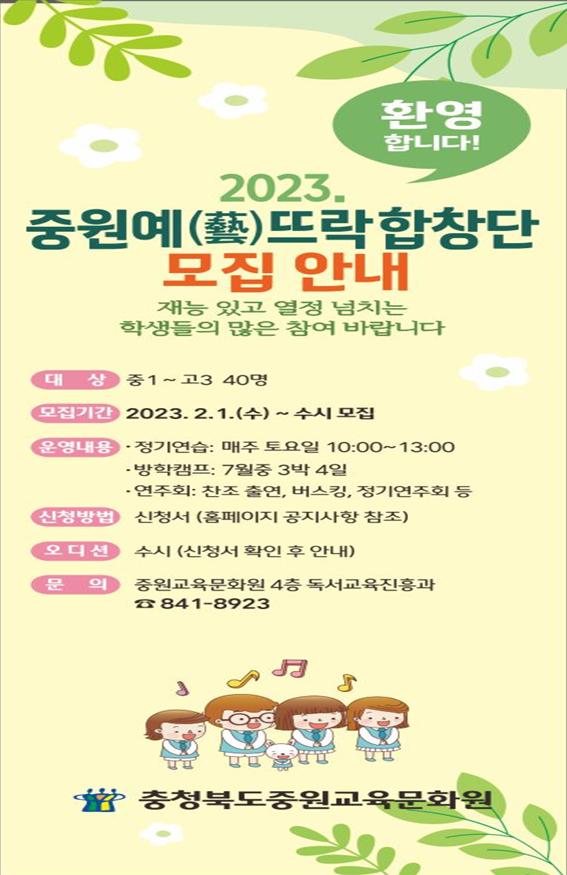 충북중원교육문화원은 이달 1일부터 3월 10일까지 충북도내 중학생 1학년부터 고등학생 3학년을 대상으로 ‘중원예(藝)뜨락합창단’ 2기 단원 15명을 모집한다.