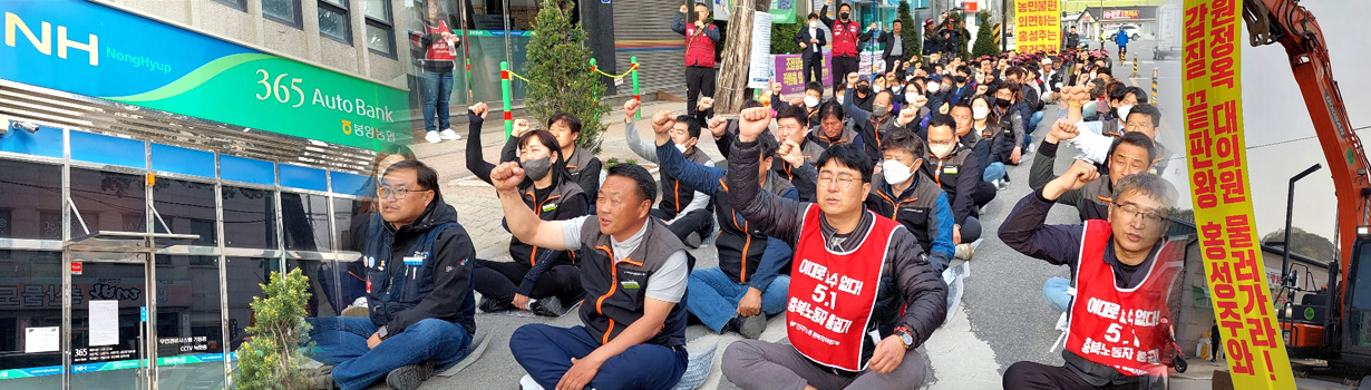 민주노총 충북본부는 지난 13일 제천시 봉양농협 앞에서 노조원 120여명이 참여한 가운데 집회를 열고 홍성주 조합장을 규탄하며 퇴진을 요구했다./최현주 기자.