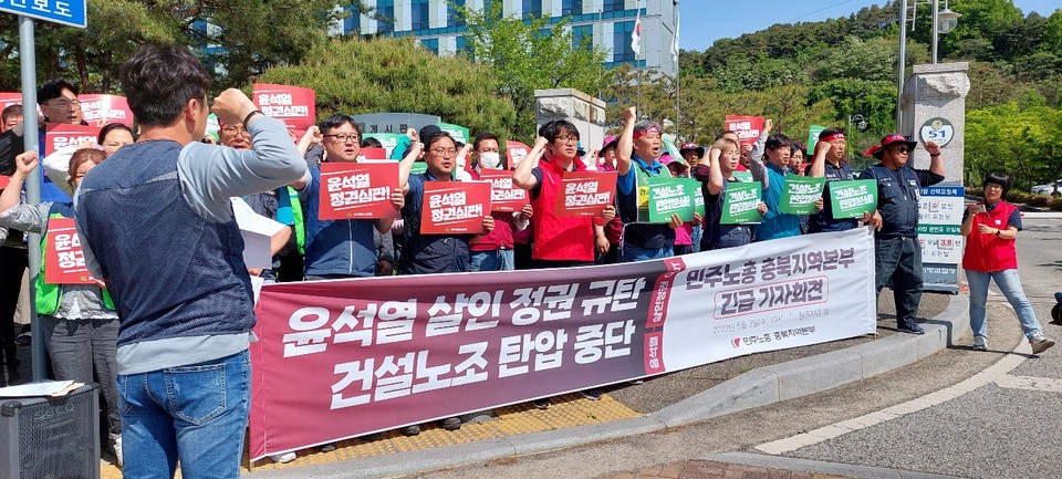 민주노총 충북지역본부는 3일 청주지방검찰청 앞에서 ‘윤석열 살인정권 규탄과 건설노조 탄압중단’을 촉구하는 기자회견을 열었다.