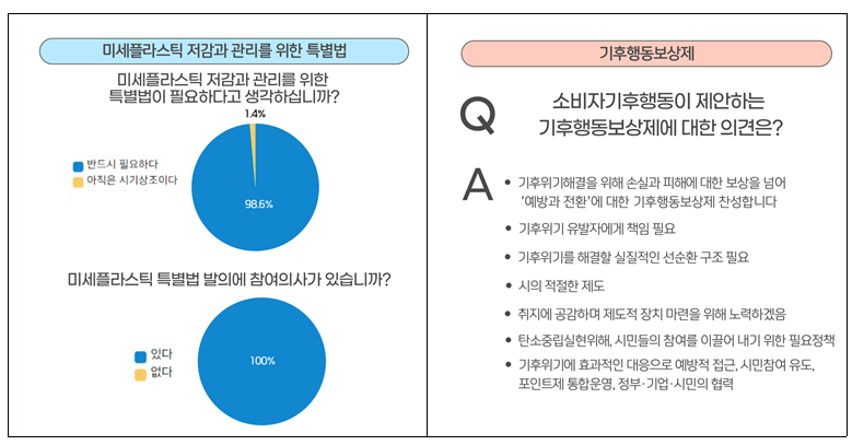 기후재난을 복구하는 비용으로 해마다 지출되는 비용을 ‘예방과 전환’을 위한 예산으로 전환하고, 탄소중립 실현을 위해 시민들의 자발적 참여를 확대할 수 있는 방안이라는 점에서 소비자기후행동이 제안한 ‘기후행동보상제’에 공감한다는 의견이 대다수였다.