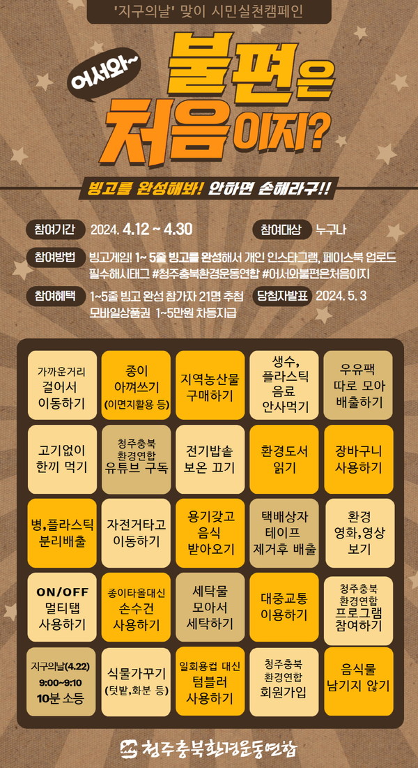 일명 ‘어서와~ 불편은 처음이지?’라는 캠페인으로 참여방법은 빙고판에 있는 과제를 실천하고 이를 개인 SNS에 인증하면 된다. 청주충북환경련은 21명을 추첨해 1만원~5만원 상당의 모바일 상품권을 지급한다는 계획이다.