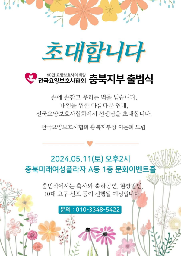 전국요양보호사협회 충북지부는 11일(토) 오후 2시 충북미래여성플라자 A동 1층 문화이벤트홀에서 출범식을 연다고 밝혔다.