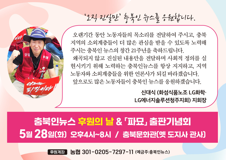 - “노동자들의 벗 '충북인 뉴스'를 응원합니다”