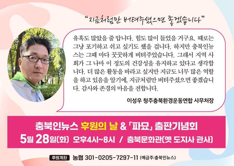 - “담백하게 진실을 탐색하는 충북인뉴스를 믿고 응원합니다”