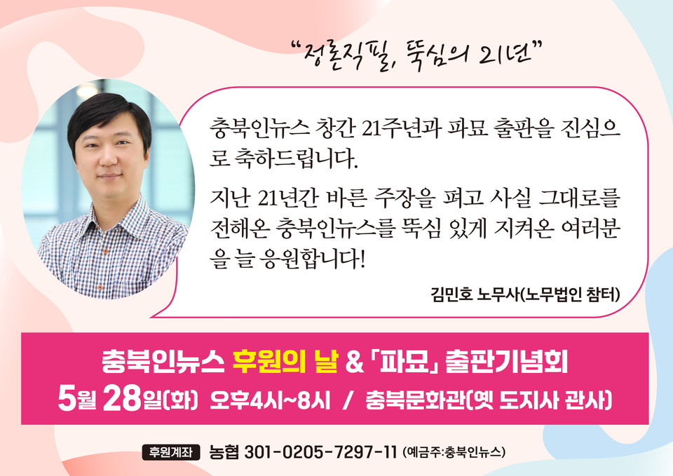 김민호 노무사는 “지난 21년간 바른 주장을 펴고 사실 그대로를 전해온 충북인뉴스를 뚝심 있게 지켜온 여러분을 늘 응원한다”고 전했다.