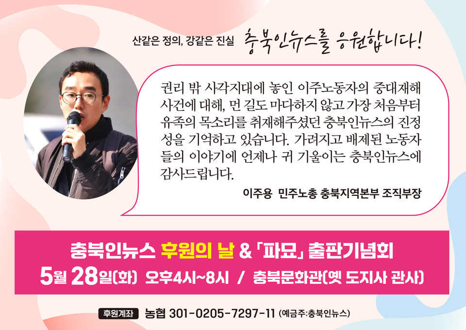 이 조직부장은 “권리 밖 사각지대에 놓인 이주노동자의 중대재해 사건에 대해, 먼 길도 마다하지 않고 가장 처음부터 유족의 목소리를 취재해주셨던 충북인뉴스의 진정성을 기억하고 있다”며 “가려지고 배제된 노동자들의 이야기에 언제나 귀 기울이는 충북인뉴스에 감사드린다”고 전했다.