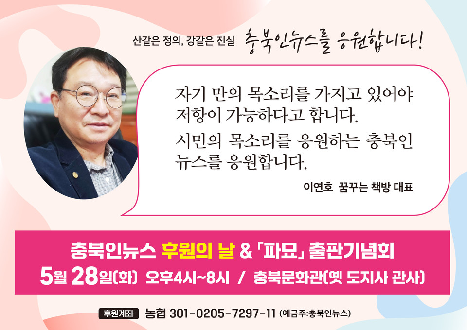 충북인뉴스 창간 21주년 기념 후원의 날 행사와 ‘파묘’ 출판기념회를 앞두고 꿈꾸는 책방 이연호 대표가 충북인뉴스를 응원하는 글을 보내 왔다.