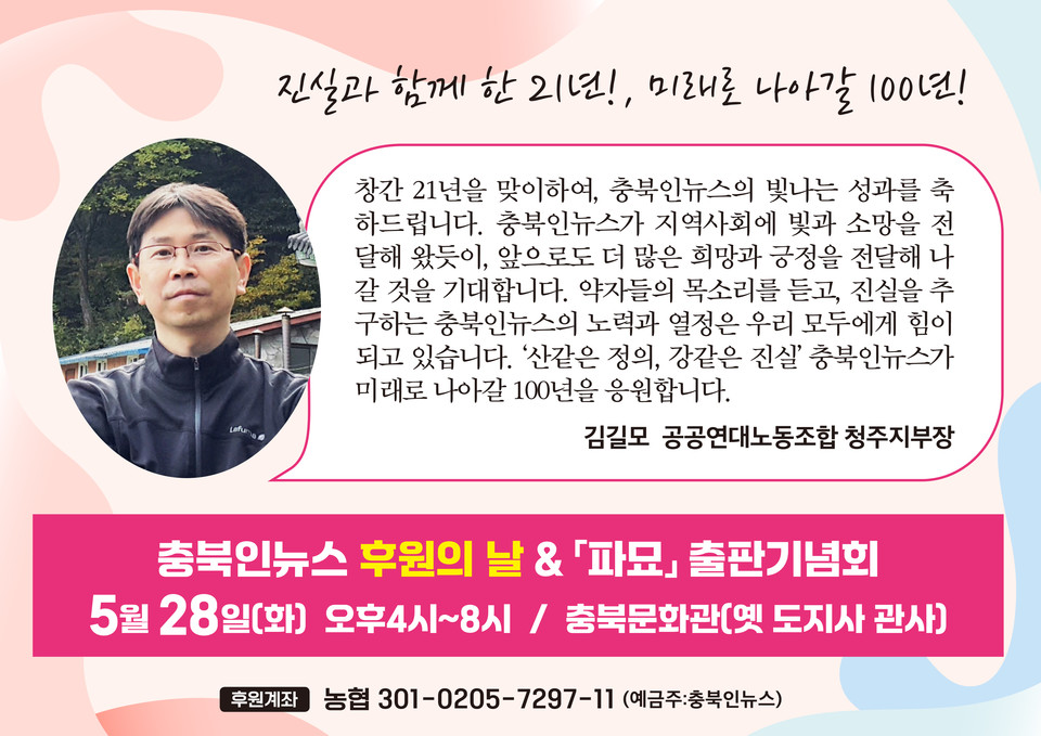 충북인뉴스 창간 21주년을 맞아 김길모 공공연대노조 청주지부장이 응원과 격려의 글을 보내왔다.