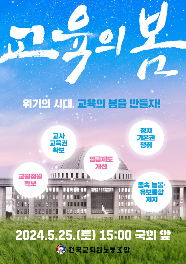 전국교직원노동조합은 창립 35주년을 맞아 25일 오후 1시 30분부터 4시 30분까지 국회 앞 의사당대로(산업은행-여의도 지하차도 사이 국회 방향 도로)에서 전국교사대회를 연다.