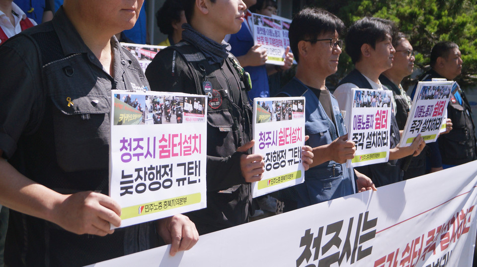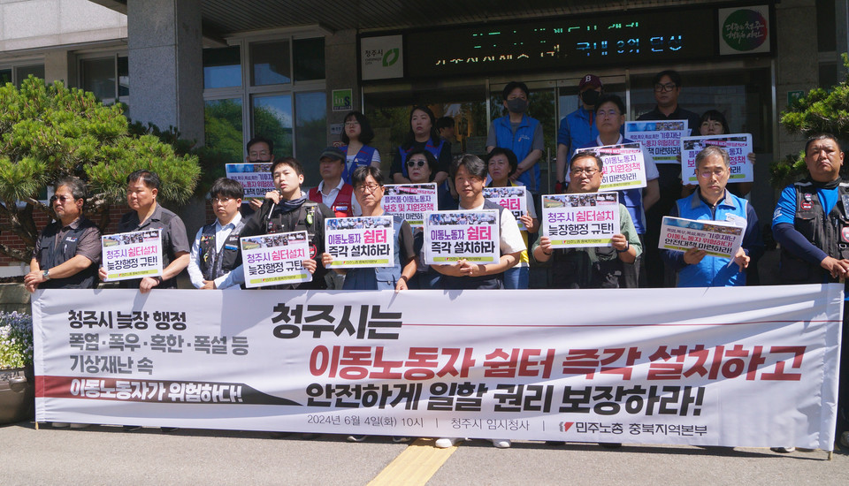 4일 민주노총 충북본부는 청주시청에서 기자회견을 열고 “거리에서 가장 오랜 시간을 보내야 하는 이동노동자들은 휴식을 취할 곳도 폭우·폭염·폭설에 피할 곳도 없다”며 “이동노동자들의 쉴 권리를 보장하고 최저 환경을 개선할 것”을 촉구했다.