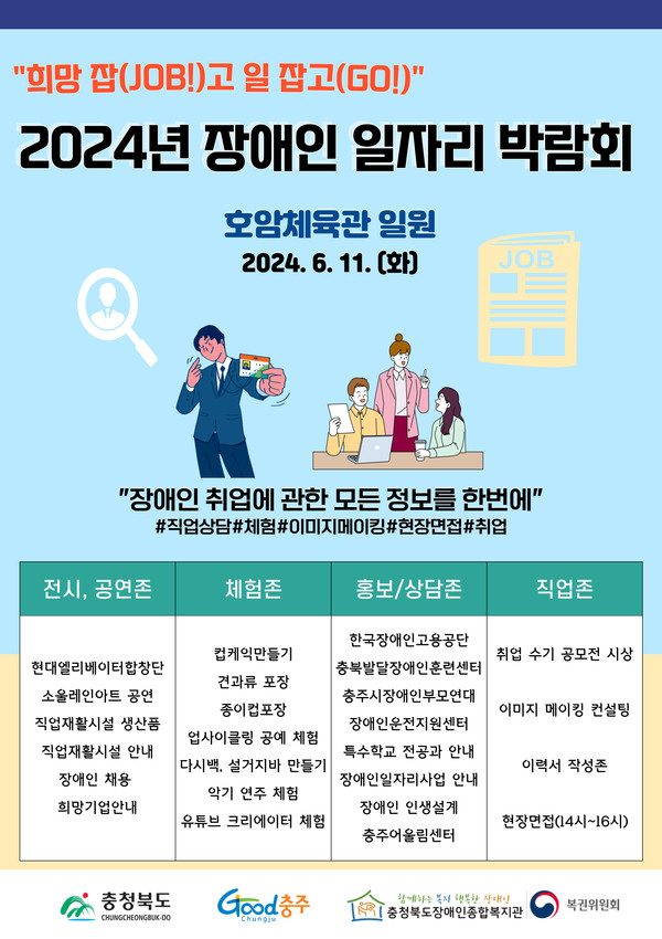 충북장애인종합복지관은 충북도와 충주시 지원을 받아 ‘2024년 장애인 일자리 박람회’를 오는 11일 호암체육관 일원에서 개최한다고 7일 밝혔다.