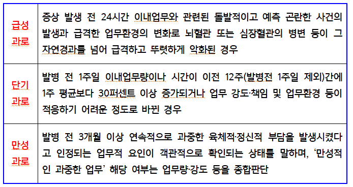 A. 고용노동부와 근로복지공단은 업무상 뇌심혈관계질병 요건을 다음과 같이 급성과로, 단기과로, 만성과로 등으로 구분하고 어느 하나에 해당하면 산재로 인정하고 있습니다.