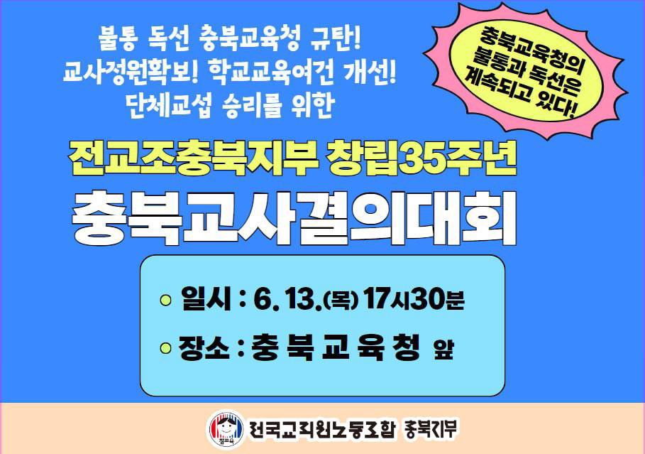 전교조 충북지부가 창립 35주년을 맞아 13일 오후 5시 30분부터 충북교육청 정문 및 분평사거리 일대에서 ‘불통과 독선의 충북교육청 규탄, 충북교사 결의대회’를 연다.