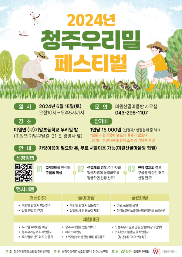 청주우리밀페스티벌추진위원회(이하 추진위)는 오는 15일(토) 오전 10시부터 오후 4시까지 청주시 미원면 (구)기암초등학교 우리밀 밭(미원면 기암구말길 31-5, 광명사 옆)에서 ‘2024년 청주우리밀 페스티벌’을 개최한다고 밝혔다.