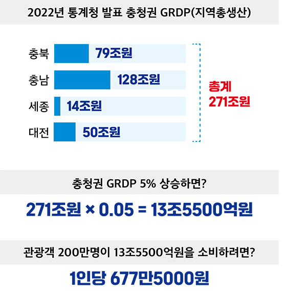 먼저 충청권의 2022년 기준(통계청 국가통계포털 발표)은 271조원 규모다. 충북 79조원, 충남 128조원, 세종 14조원, 대전 50조원 등이다. 김 지사가 주장대로 충청권 GRDP가 5% 상승하면 그 액수는 무려 13조5500억원에 달한다.