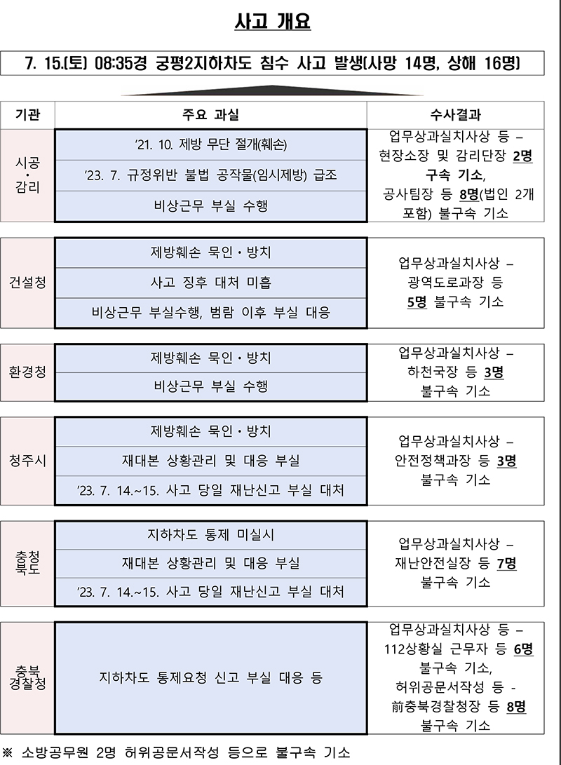 19일 청주지검 ‘오송지하차도 침수사건 수사본부(본부장 박영빈 검사장)’는 보도자료를 통해 충북도청 공무원 7명과 청주시 공무원 7명 등 총 10명을 ‘업무상과실치사상죄’로 불구속 기소했다고 밝혔다.