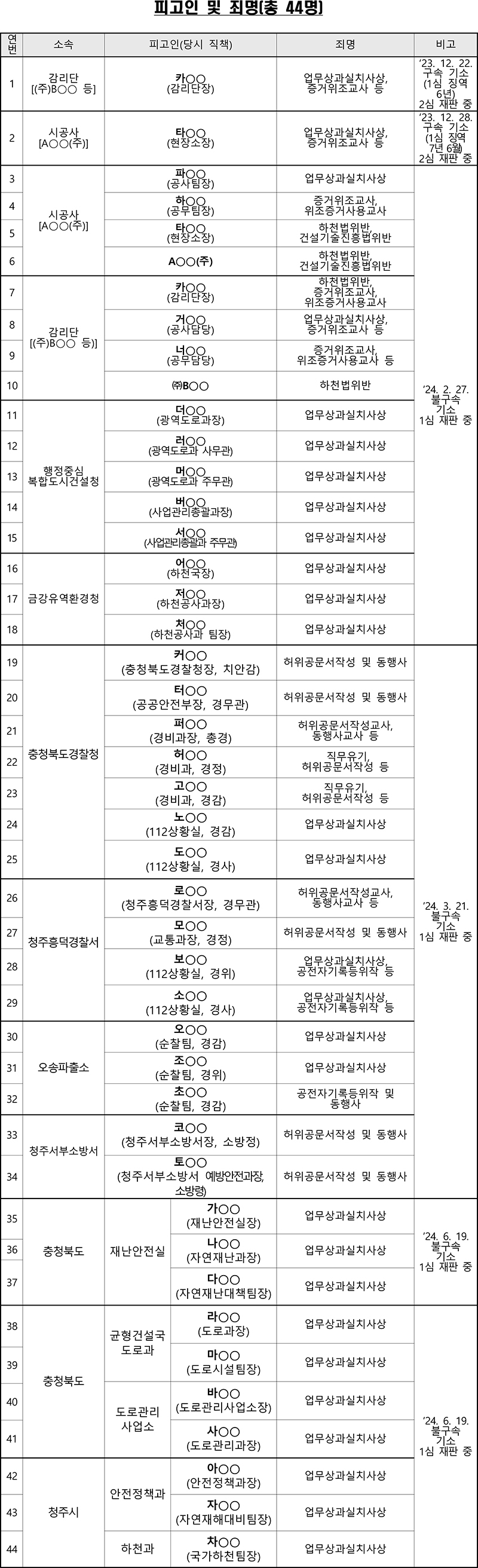 제방 시공사 현장소장과 감리단장 2명이 구속기소됐고, 행복청과 금강유역화경청, 충북도청과 청주시청 그리고 충북경찰청과 청주소방서 공무원이 기소됐다.