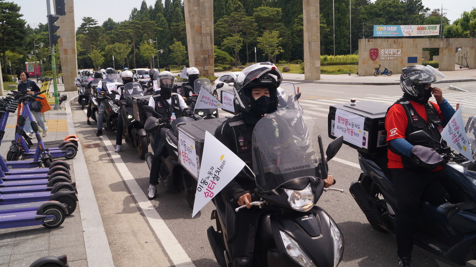 이들은 충북대 정문에 모여서 실제 업무에 사용하는 휠, 전동킥보드, 오토바이 등 이동수단을 타고 행진에 참여했다.