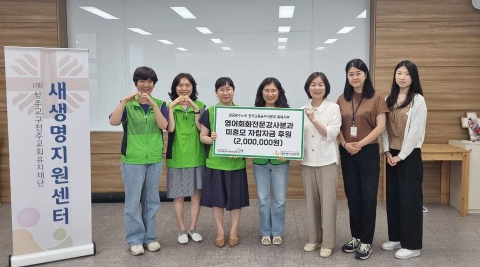 민주노총 공공운수노조 전국교육공무직본부 충북지부 영어회화전문강사분과는 지난 19일 재단법인 새생명지원센터를 방문해 미혼모 자립자금 200만 원을 전달했다. 이 돈은 앞으로 미혼모 두 명에게 각각 100만 원씩 전달, 자립을 위한 지원금으로 쓰일 예정이다.