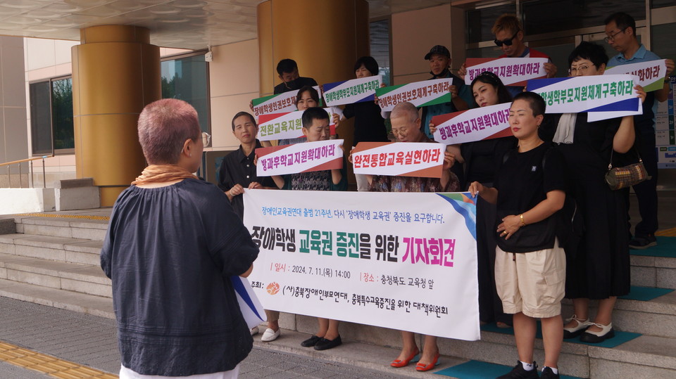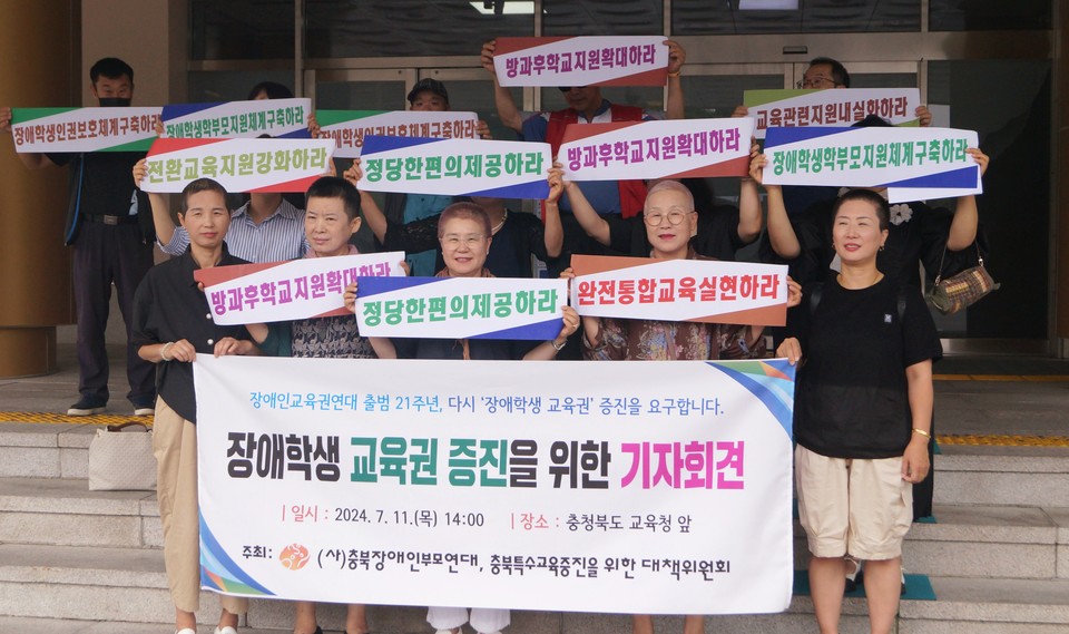 11일 부모연대와 충북특수교육증진을 위한 대책위(이하 대책위)는 충북교육청 앞에서 기자회견을 열고 "장애인교육권연대의 투쟁으로 2007년 ‘특수교육법’이 제정됐다"며 "법 시행 17년이 지났음에도 물리적인 통합만 이루어진 학교에서 장애학생들은 여전히 교육받을 권리를 침해 당하고 있다"고 비판했다.