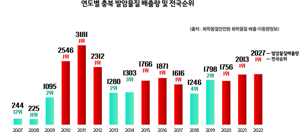 화학물질안전원에 따르면 2022년 충북지역은 2027톤의 발암물질을 배출해 전국 16개 광역시도(제주도 제외) 중 배출량 1위를 기록했다. 2020년 이후 3년 연속 1위라는 오명을 이어가고 있다.