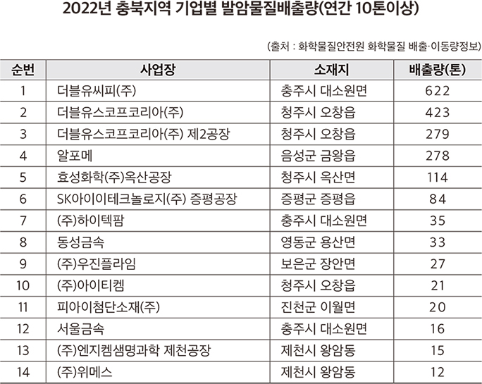 2022년 충북지역에서 발암물질을 연간 10톤 이상 배출하는 기업은 총 14곳으로 나타났다.