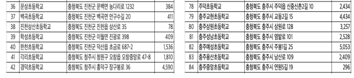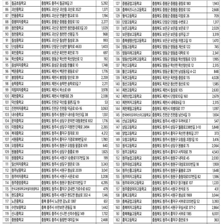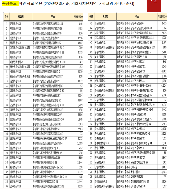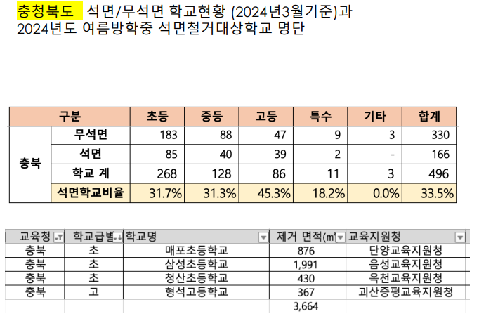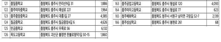 다음은 석면보고서에서 밝힌 충북지역 석면건축물이 남아있는 학교 현황이다.