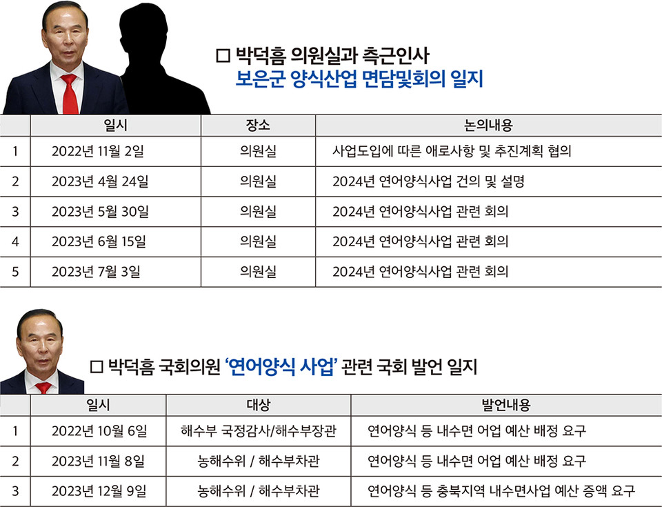 소속 보좌관들이 A씨와 업체관계자의 논의를 하는 동안 박덕흠 국회의원은 국회 농해수위에서 해수부장관과 차관을 상대로 관련 예산을 배정하라고 압박했다.