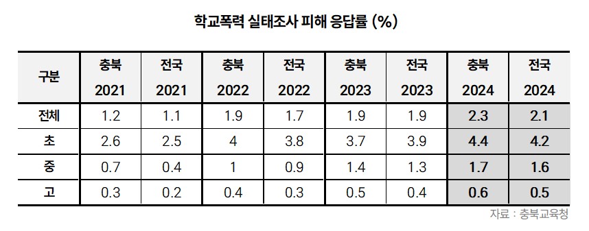 이달 26일 충북도교육청은 ‘2024년 1차 학교폭력 실태조사’ 결과를 발표했다. 조사 결과 학교폭력 피해 응답률은 2.3%(2284명)로 학교폭력 전수조사 이후 최대치를 기록했다.