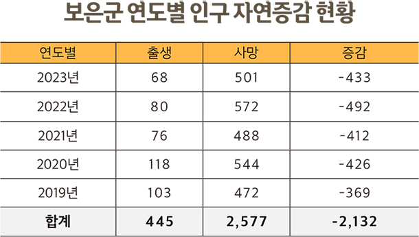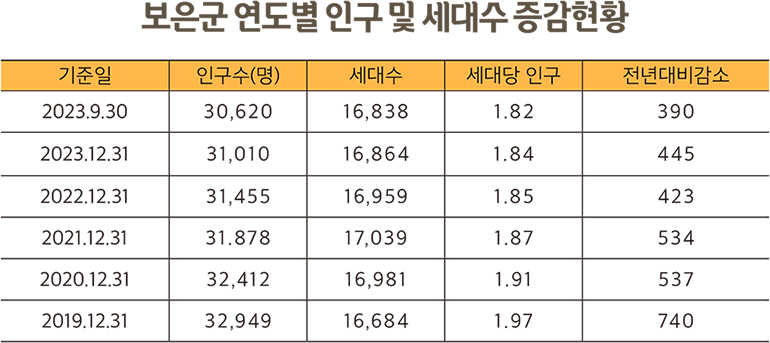 한편 보은군은 2023년 출생‧사망통계에 따른 자연감소 통계를 적용하면 이론적으로 72년 후에 ‘인구 제로(0명)’ 시대를 맞게 된다.