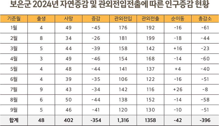 올 한해 보은군으로 전입한 인구는 1316명인데 비해, 관외 지역으로 1358명이 전출했다. 이로 인해 9개월 동안 42명의 인구가 감소했다.