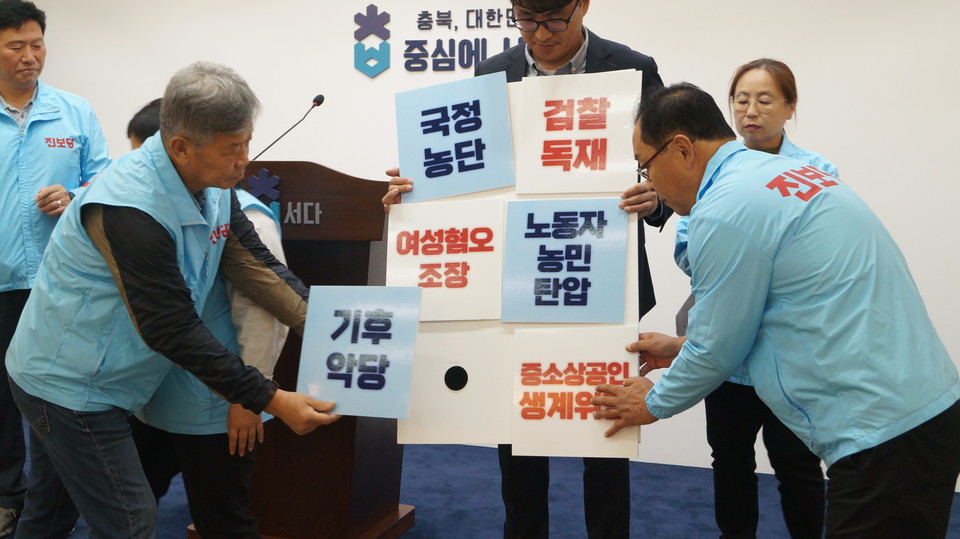 23일 진보당 충북도당은 충북도청에서 기자회견을 열고 "반민주ㆍ반헌법ㆍ반민생 윤석열 정부는 4월 총선 정권 심판에도 불구하고 노조법 개정안, 채상병 특검법 등 여전히 거부권을 남발하고 있다"며 "검찰은 김건희 여사의 도이치 모터스 주가조작 혐의에 관련해 불기소 처분을 내렸다"고 비판했다.