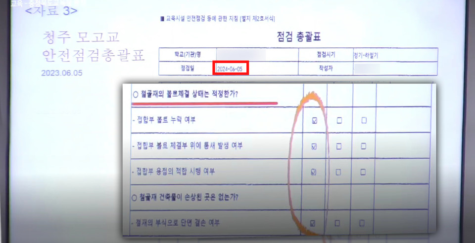 또한 “A학교가 지난해 3월과 사고 발생 2주 전인 올해 6월 진행한 학교안전점검총괄표에는 철골제 접합부의 볼트 누락, 체결 부위의 틈새 발생, 용접의 적합 여부 등 구체적인 점검 상태가 모두 ‘적합’하다고 체크되어 있다”며 “학교 안전점검이 형식적이고 부실하게 이루어진다는 의심이 든다”고 주장했다.