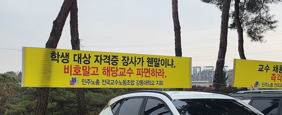 지난 20일 민주노총 전국교수노동조합 강동대학교지회는 학내 곳곳에 현수막을 내걸고 A교수에 대한 빠른 인사조치를 촉구했다.