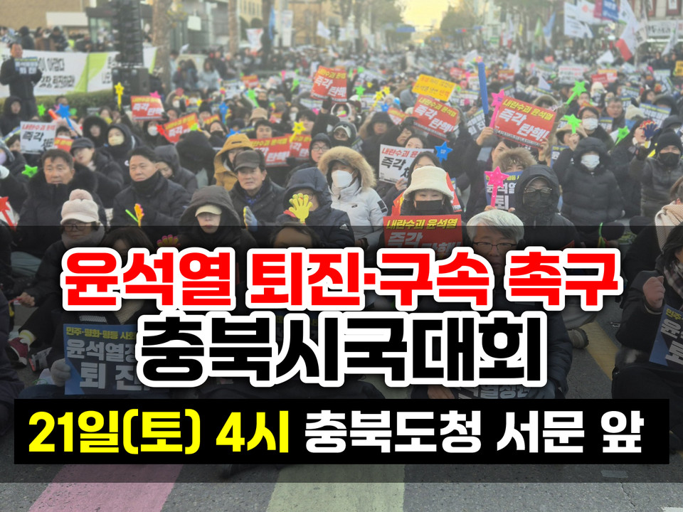 ‘윤석열 퇴진! 민주·평화·평등 사회대전환! 충북비상시국회’는 ‘윤석열 즉각 퇴진·구속 수사! 내란동조 국민의힘 해체! 민주·평화·평등 사회대전환! 9차 충북도민시국대회’를 21일 오후 4시 충북도청 서문앞에서 진행한다고 밝혔다.