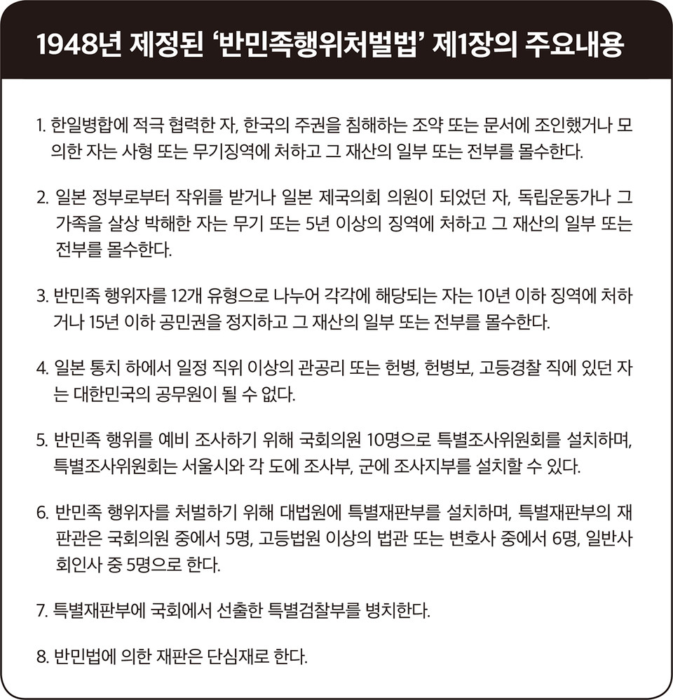 1945년 8월 15일 제저된 제헌헌법 101조는 “이 헌법을 제정한 국회는 1945년 8월 15일 이전의 악질적인 반민족행위를 처벌하는 특별법을 제정할수 있다”고 규정했다.