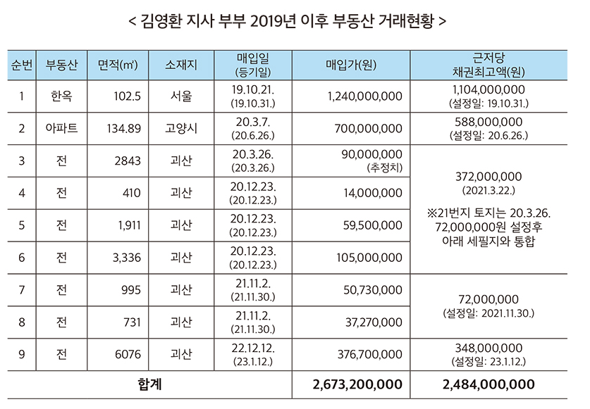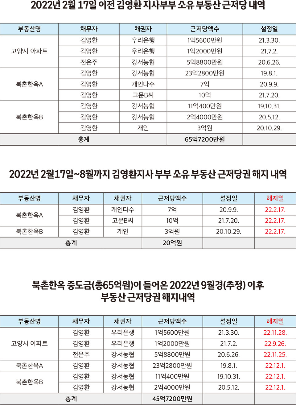 2022년 2월 17일당시 농협과 우리은행 등은 김 지사 부부의 부동산에 총 6번에 걸쳐 45억원대의 근저당을 설정한 상태다.