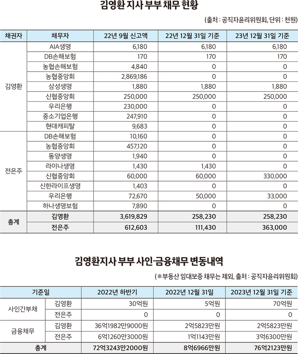 2023년 12월 31일 기준 부부합산 76억여원의 채무를 가지고 있는 김영환 지사가 대선을 한달 앞둔 시점에 30억원을 거액을 빌린 이유와 사용처에 대한 궁금증이 커지고 있다.
