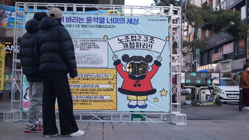 새로운 집회 모습이 신기한 듯 기념 사진을 찍는 외국인과 노조법2·3조 개정안의 취지를 한참 읽다가 촬영해가는 이들도 있었다.