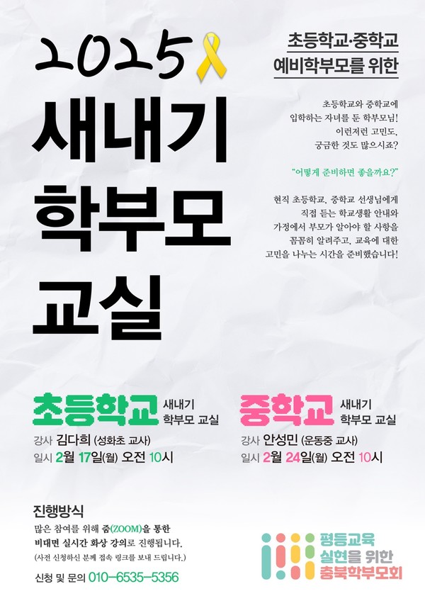 평등교육실현을위한충북학부모회는 오는 17일과 24일 초·중학교 신입생 학부모를 대상으로 한 ‘새내기 학부모 교실’을 각각 운영한다고 밝혔다.