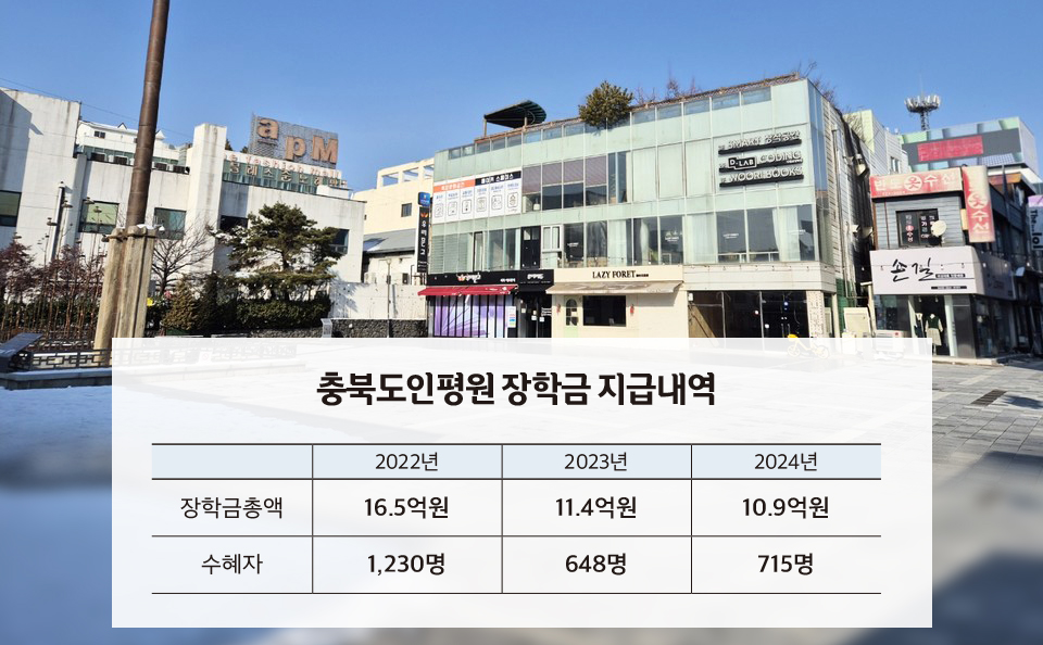 100억원대 고가의 부동산을 매입한 충북인재평생교육진흥원(이하 충북도인평원)이 2023년과 2024년 장학금 지급액을 대폭 삭감한 것으로 나타났다.
