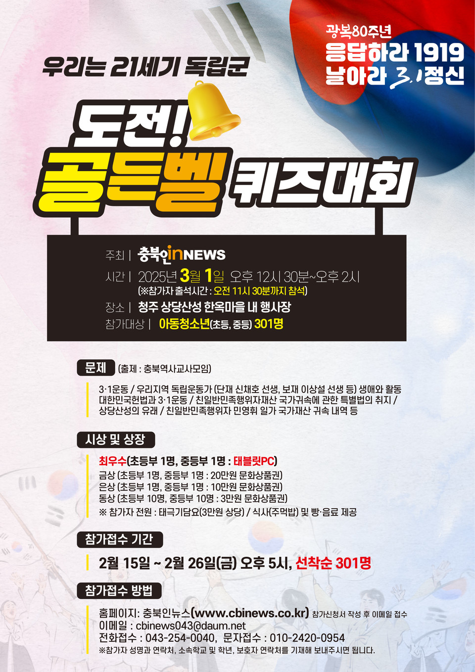 참가 대상은 초등학생과 중학생이다. 3‧1절을 맞아 총301명을 선착순으로 모집한다. 신청 방법은 충북인뉴스 홈페이지와 전화(043 254 0040), 이메일(cbinews043@daum.net), 문자(01024200954)로 받는다. 마감기한은 26일 오후 5시다.