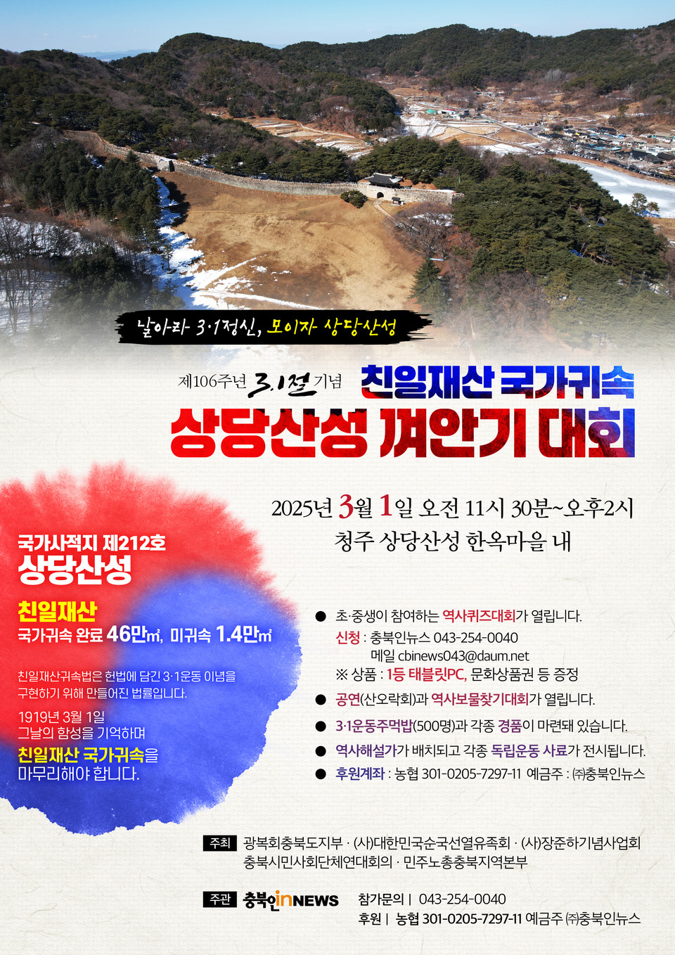 이번 행사는 3월 1일 11시30부터 오후 2시까지 국가사적지 212호인 청주상당산성에서 열린다.