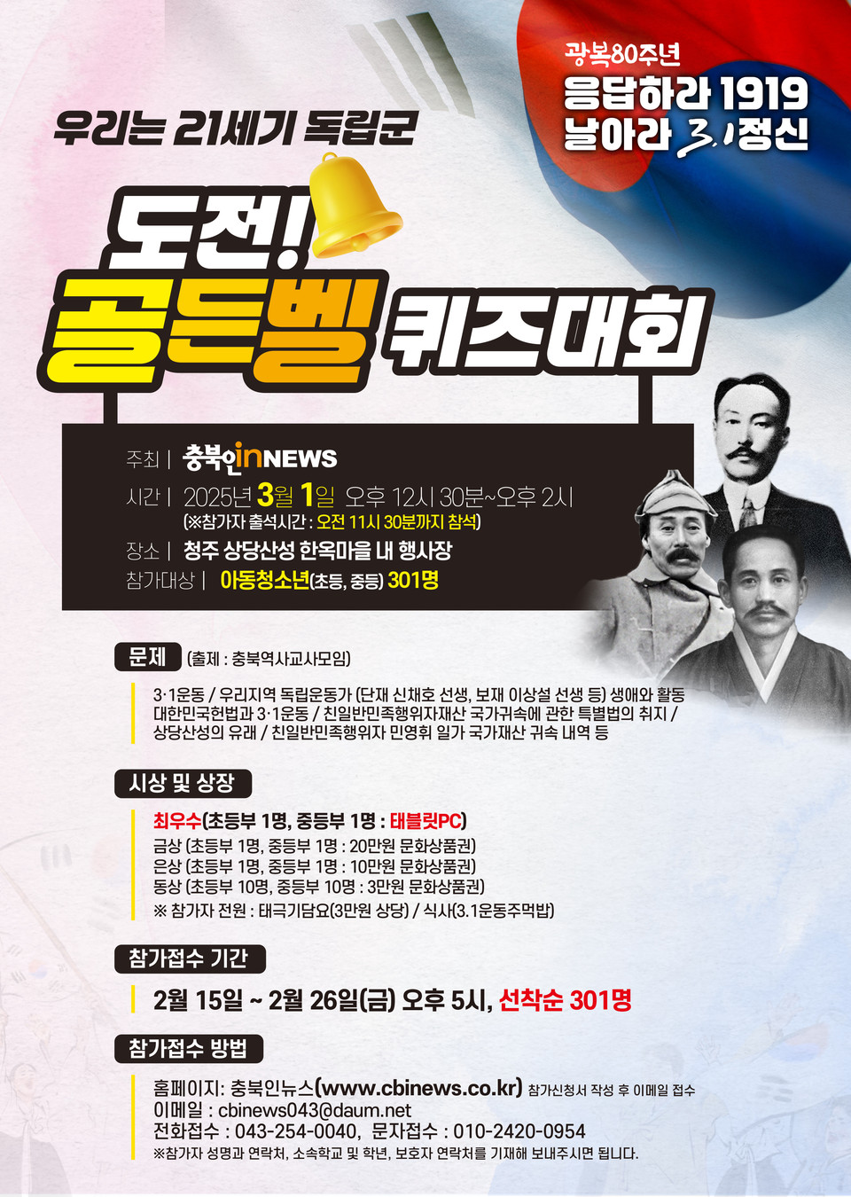 퀴즈대회 참가는 충북인뉴스 홈페이지에서 신청서를 다운받아 이메일(cbinews043@daum.net)로 보내거나, 문자메시지(01024200954)로 접수할수 있다.