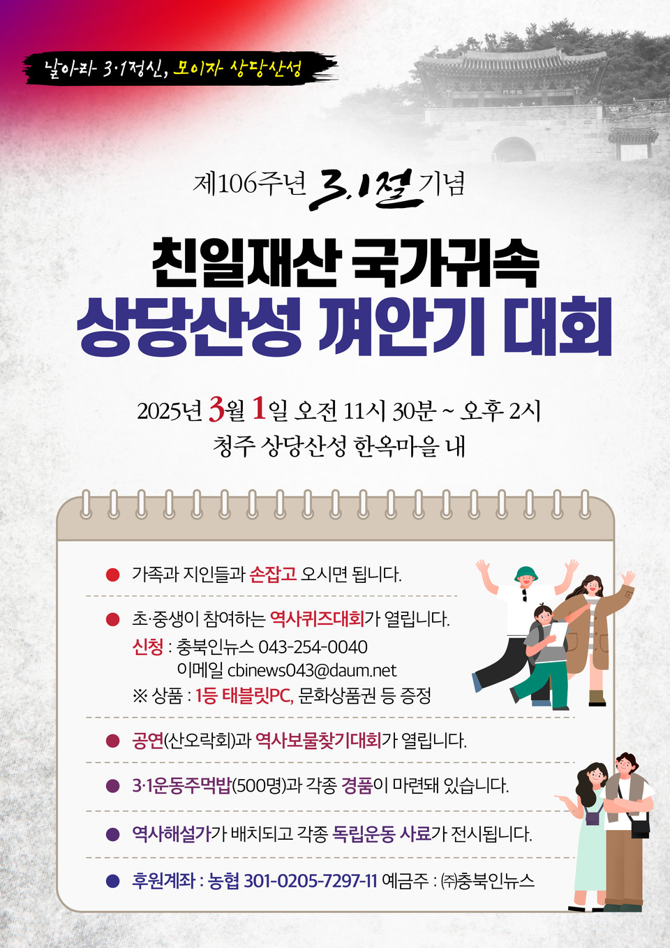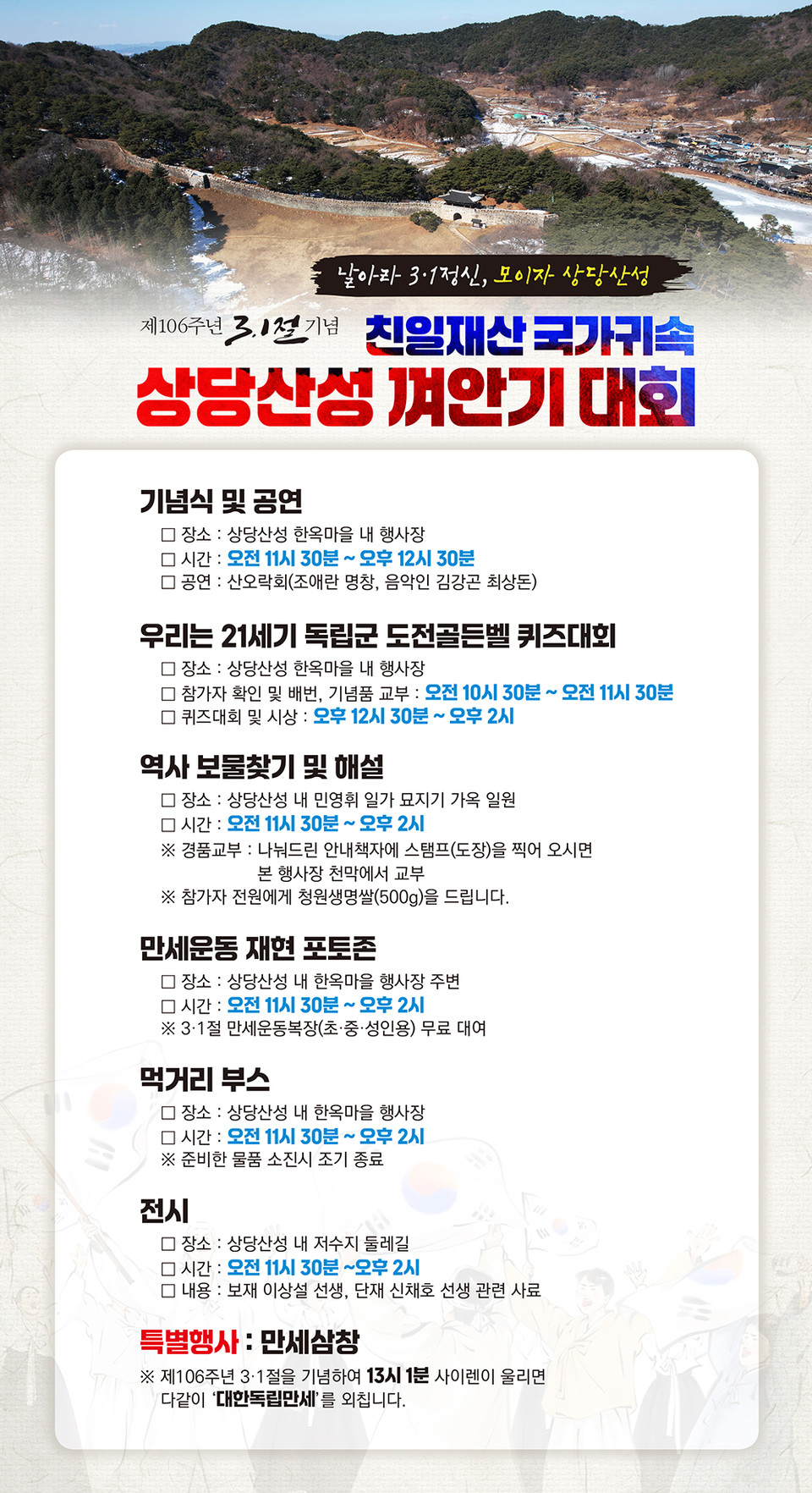 오는 3월 1일 11시 30분부터 2시까지 진행될 <광복80주년, 제106주년 3‧1절 국가귀속 상당산성 껴안기>대회가 보고 듣고 참여하는 행사로 진행된다.