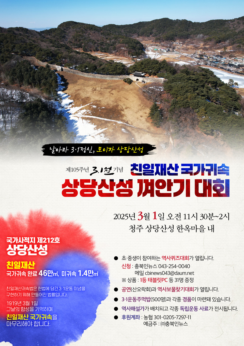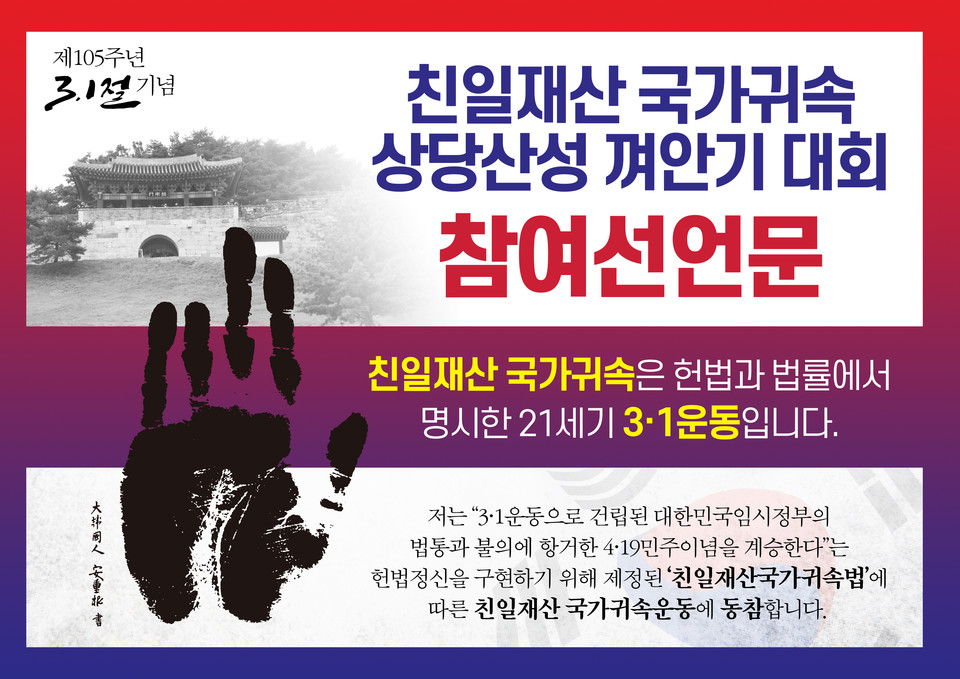 본보는 오는 3월 1일 ’친일재산국가귀속법‘에 의해 국가에 귀속된 청주 상당산성에서 ’제106주년 3‧1절 기념 국가귀속 상당산성 껴안기 대회‘를 진행한다.