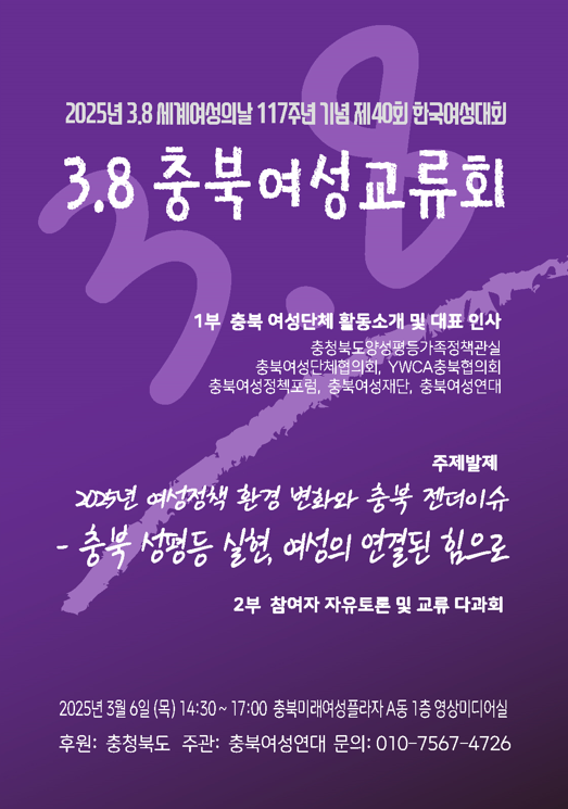 이날 발제 주제는 ‘2025년 여성정책 환경 변화와 충북 젠더 이슈-충북 성평등 실현, 여성의 연결된 힘으로’이다. 발제 이후 2부에서는 충북지역 여성단체들의 화합 및 교류의 자리가 마련될 예정이다.
