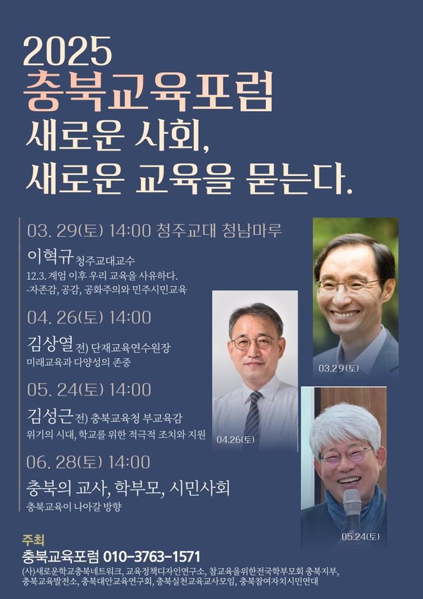 오는 29일 이혁규 청주교대 교수를 시작으로 4월 26일에는 김상열 전 단재교육연수원장이, 5월 24일에는 김성근 전 충북교육청 부교육감이 강의를 진행할 예정이다.