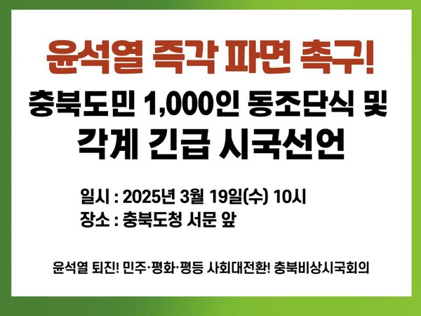 이에 ‘윤석열 퇴진! 민주·평화·평등 사회대전환! 충북비상시국회의(이하 비상시국회의)’는 오는 19일 오전 10시 충북도청 서문 앞에서 기자회견을 열고, 윤 대통령 파면을 촉구하는 1000인 동조 단식 및 각계 긴급 시국선언을 할 것이라고 18일 밝혔다.
