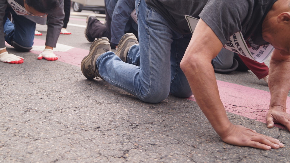 이날 여성, 장애인, 노동, 시민사회 등 시민단체 대표와 시민 등 40여명이 삼보일배 행진을 진행했다.